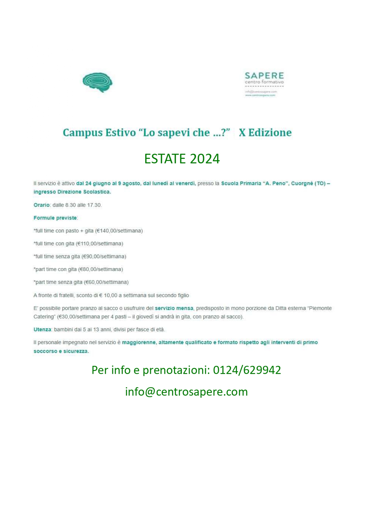CENTRO SAPERE: dai 5 ai 13 anni; dal 24 giugno al 9 agosto; full time e part time