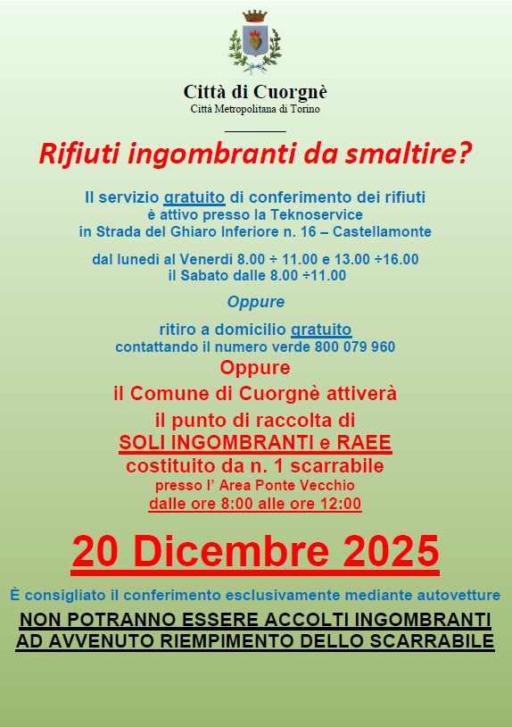 - oppure il Comune di Cuorgnè SABATO 20 DICEMBRE attiverà il punto di raccolta di SOLI INGOMBRANTI e RAEE costituito da n.1 scarrabile presso l'area Ponte Vecchio dalle ore 8:00 alle ore 12:00