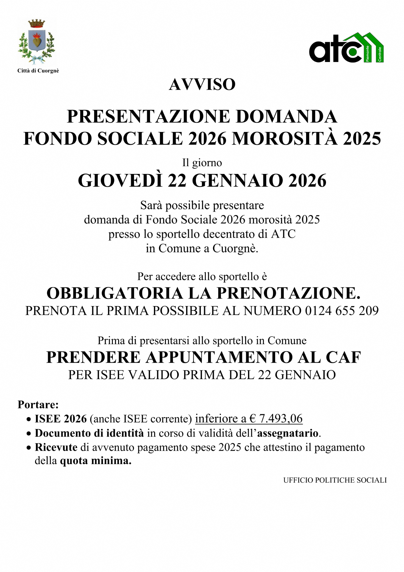Il giorno GIOVEDÌ 22 GENNAIO 2026 sarà possibile presentare domanda di Fondo Sociale 2026 morosità 2025 presso lo sportello decentrato di ATC in Comune a Cuorgnè.