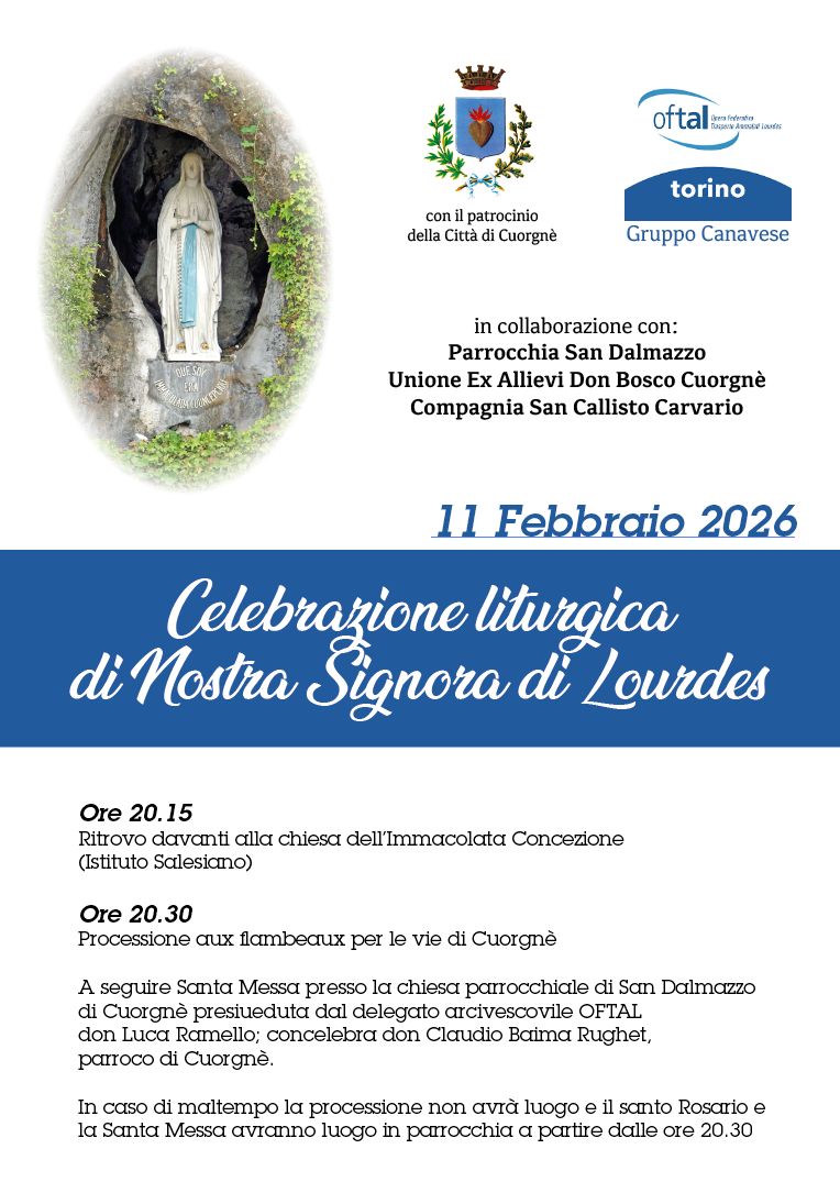 CELEBRAZIONE LITURGICA DI NOSTRA SIGNORA DI LOURDES Mercoledì 11 febbraio 2026  ore 20:15 Ritrovo davanti alla Chiesa dell'Immacolata Concezione (Istituto Salesiano)ore 20:30 Processione aux flambeaux per le vie di Cuorgnè A seguire Santa...