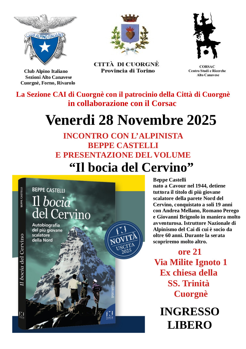 Venerdi 28 NOVEMBRE Beppe Castelli Il “Bocia” del Cervino. Ricordi di un protagonista piemontese.