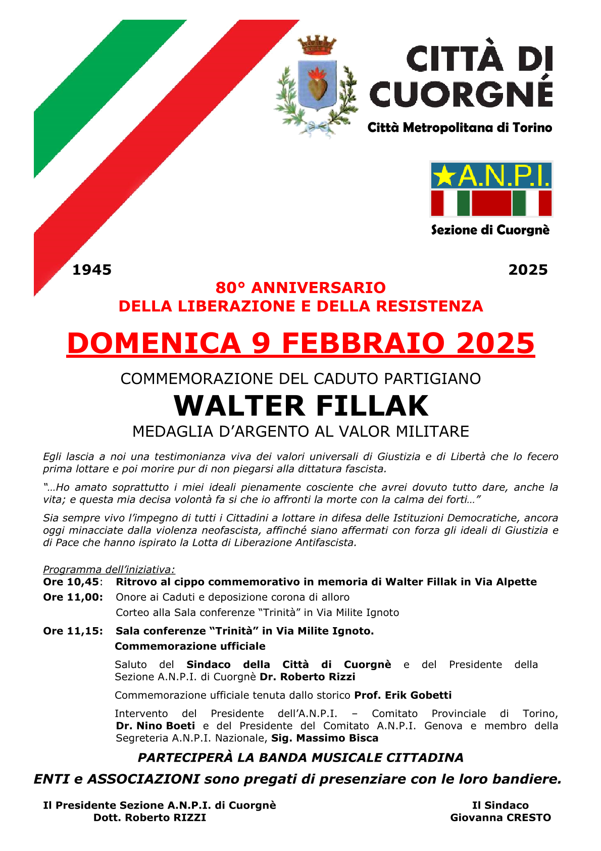80° anniversario della Liberazione e della Resistenza: Domenica 9 febbraio 2025 commemorazione del caduto partigiano Walter Fillak, medaglia d'argento al valor militare.