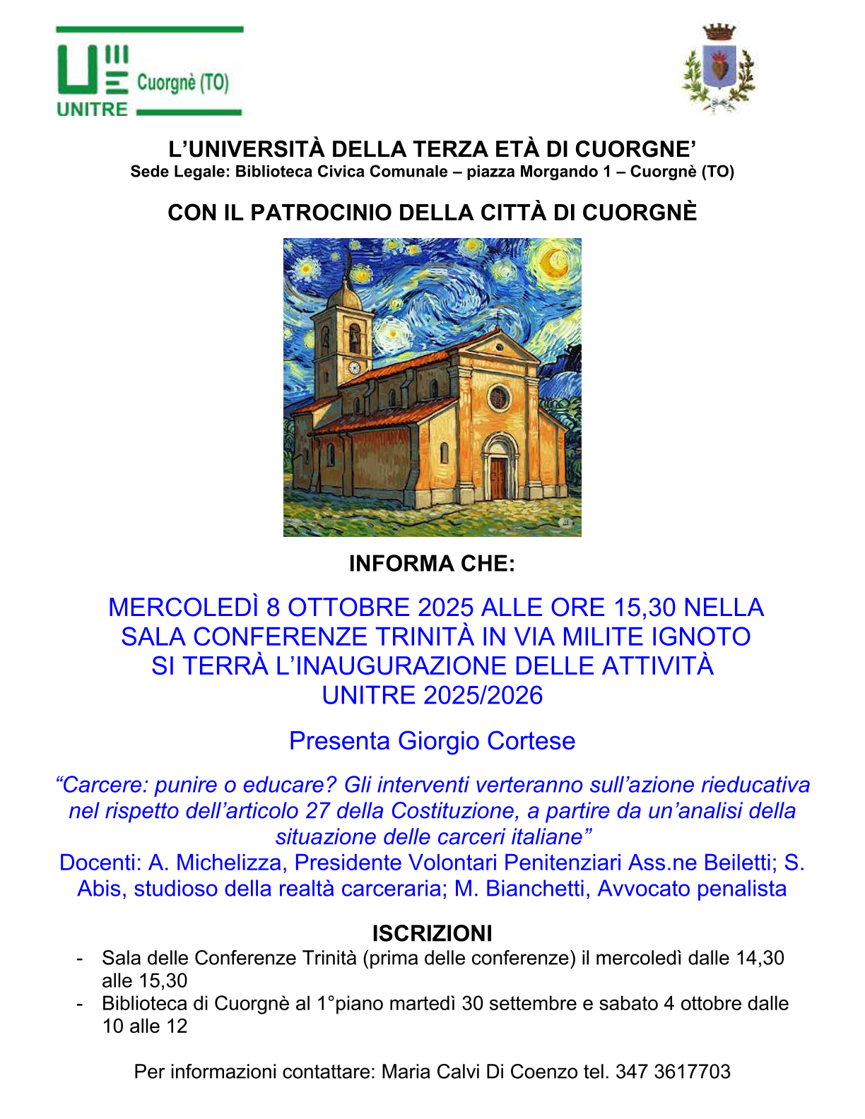 Mercoledì 8 ottobre 2025 alle ore 15,30 nella sala conferenze Trinità, in via Milite Ignoto, si terrà l'inaugurazione dell'attività UNITRE 2025/2026, presenta Giorgio Cortese: