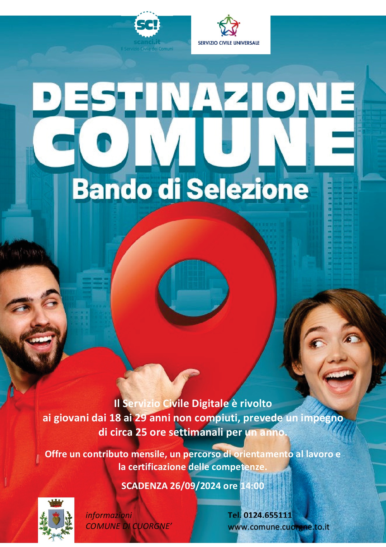 Il Comune di Cuorgnè (TO) informa che è stato pubblicato il bando di selezione di servizio civile digitale (scadenza 03/10/2024 ore 14,00). Il Comune di Cuorgnè selezionerà n. 1 giovane che sarà inserito per un anno nei servizi comunali con un impegno di 25 ore settimanali.