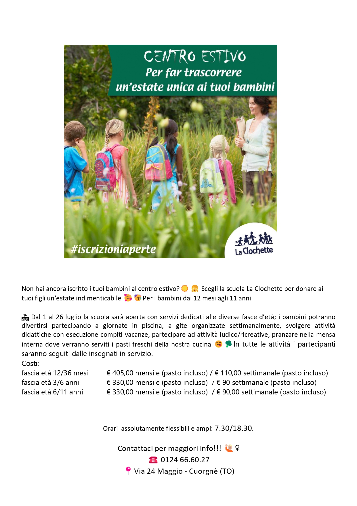 LA CLOCHETTE: dai 12 mesi agli 11 anni; dal 1°luglio al 26 luglio; orari flessibili 7.30/18.30
