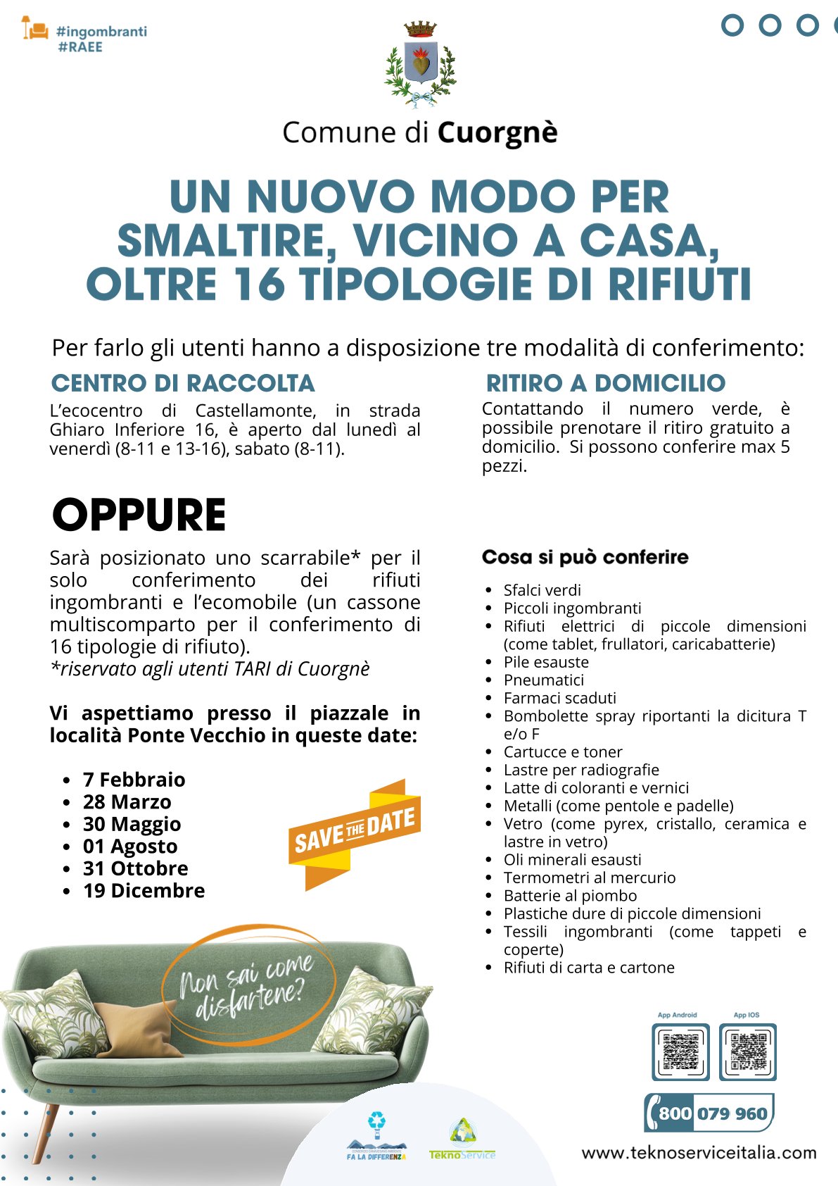 - RITIRO A DOMICILIO: contattando il numero verde, è possibile prenotare il ritiro gratuito a domicilio. Si possono conferire max 5 pezzi;