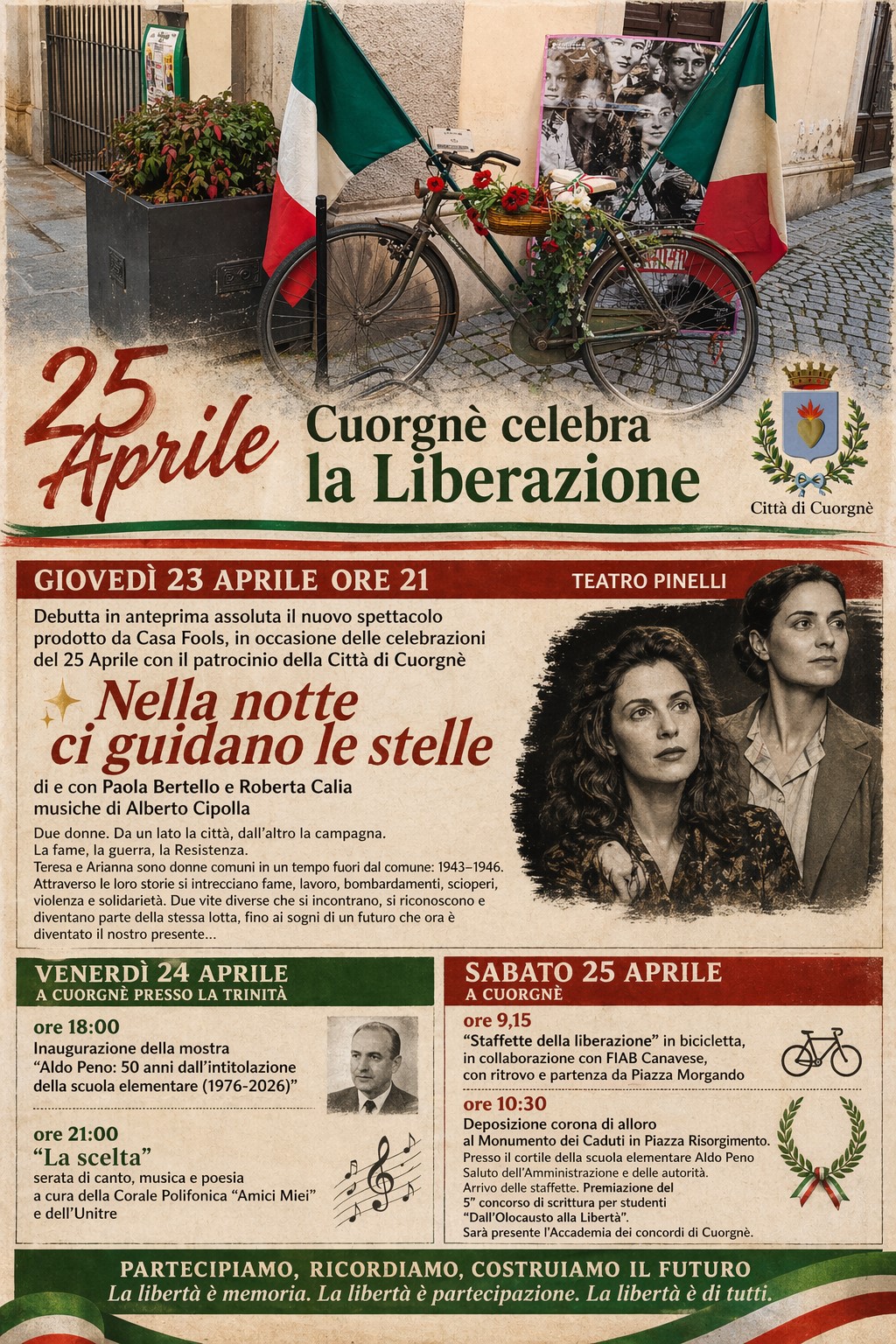 - Debutta in anteprima assoluta il nuovo spettacolo prodotto da Casa Fools, in occasione delle celebrazioni del 25 Aprile con il patrocinio della Città di Cuorgnè "Nella Notte ci guidano le stelle" di e con Paola Bertello e Roberta Calia, musiche di Alberto Cipolla