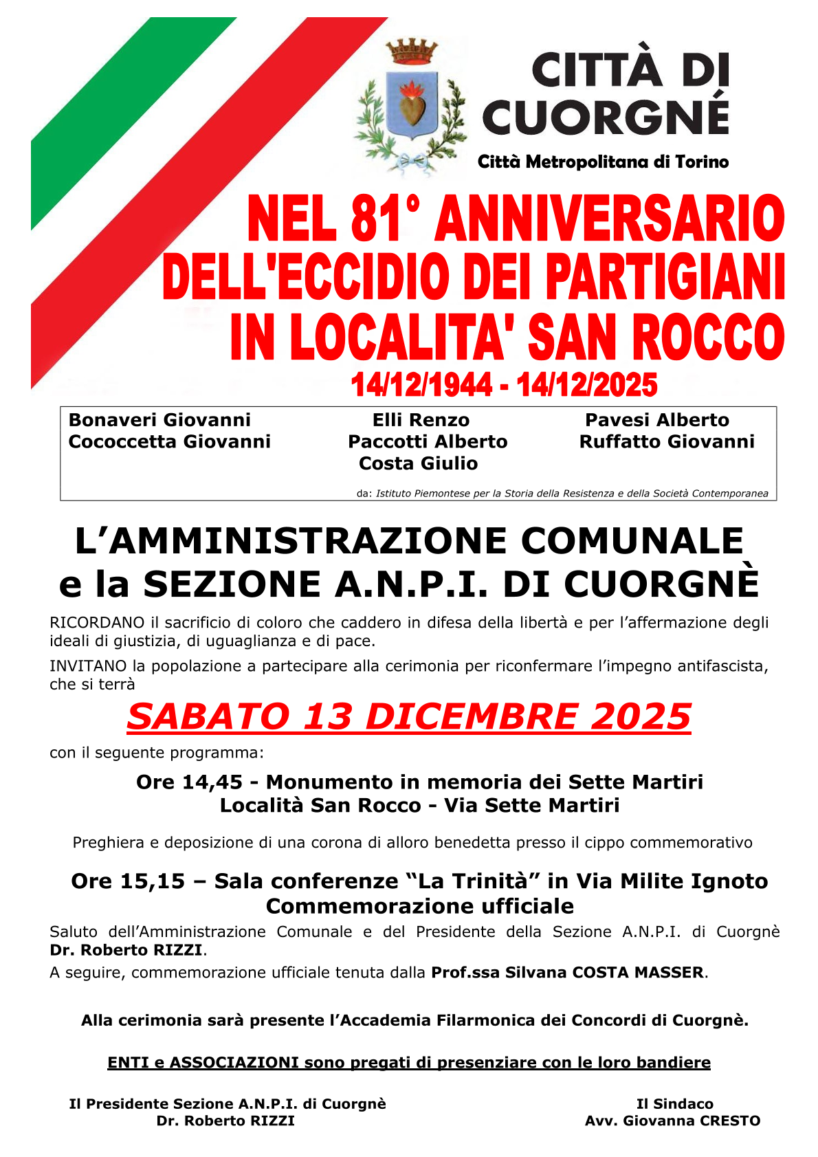 - INVITANO la popolazione a partecipare alla cerimonia per riconfermare l'impegno antifascista, che si terrà: SABATO 13 DICEMBRE 2025
