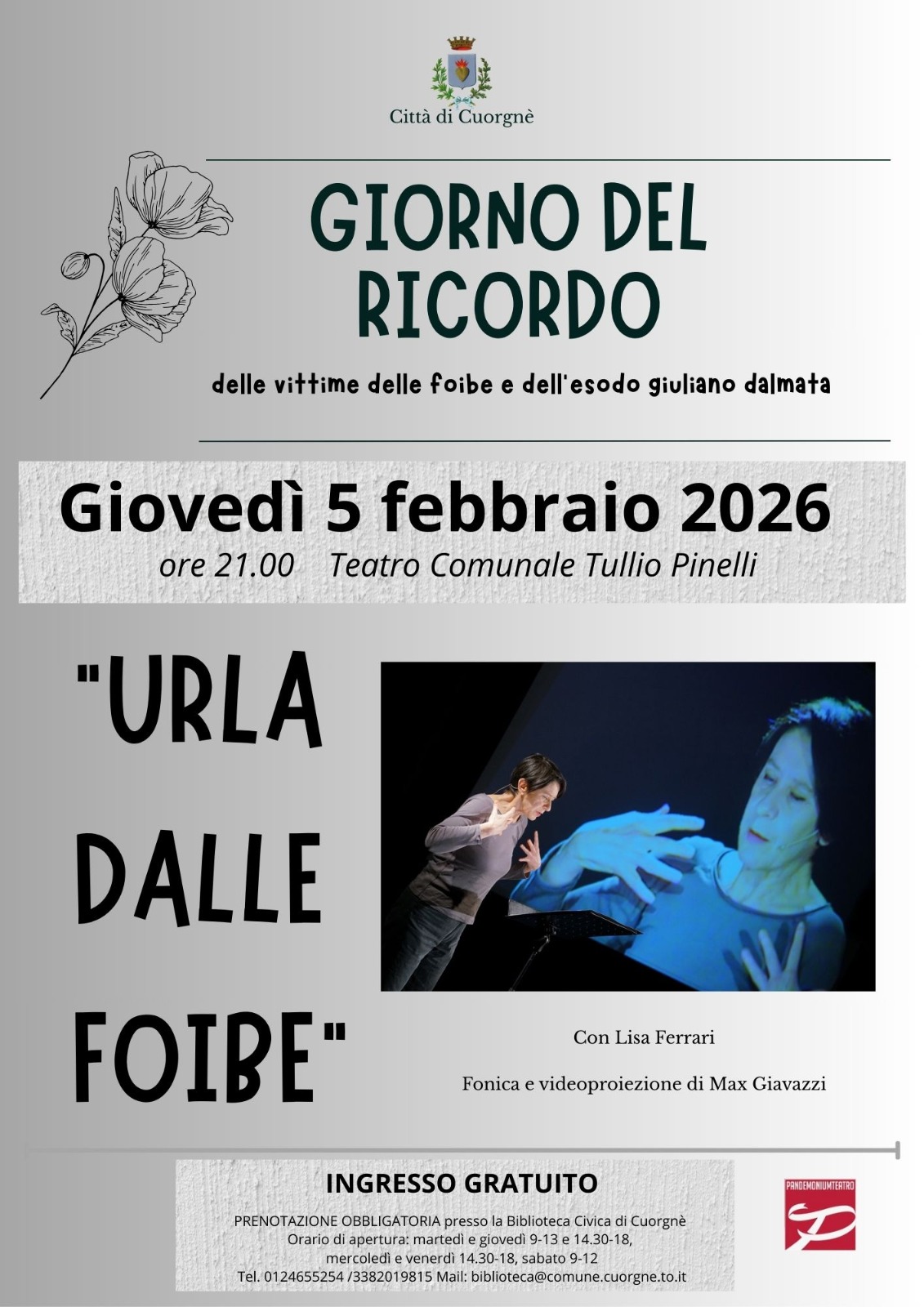 In occasione del Giorno del Ricordo è stato organizzato lo spettacolo "Urla dalle foibe" per le ore 21:00 di giovedì 5 febbraio 2026 presso il Teatro comunale Tullio Pinelli