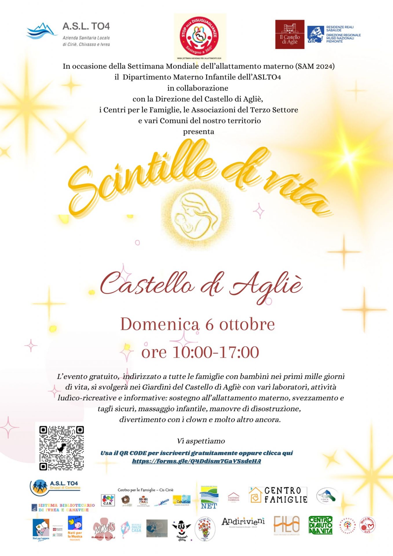 In occasione della Settimana Mondiale dell'allattamento materno (SAM 2024) il Dipartimento Materno Infantile dell' ASLTO4 in collaborazione con il Castello di Agliè, i Centri per le Famiglie, le Associazioni per il Terzo Settore e vari Comuni del nostro territorio presenta nei Giardini del Castello di Agliè un evento gratuito indirizzato a tutte le famiglie con bambini nei primi mille giorni di vita